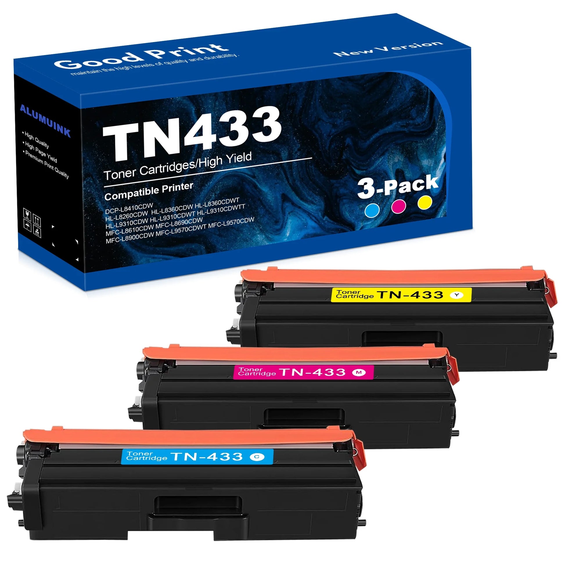 - Package Contents: 3 Pack TN433 High Yield Toner Cartridge (Color: Cyan/ Yellow/ Magenta)